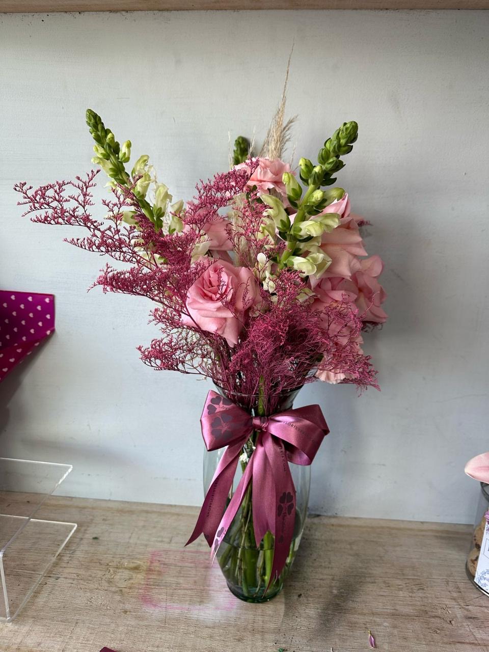 Bouquet elegante con licianthus, rosa y pampagras, con florero de cristal incluido.